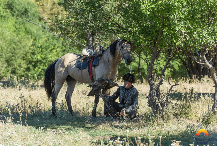 Третий верный способ почувствовать себя кочевником - подержать на руке прирученного беркута, представить на мгновение себя в роли номада-охотника, который по несколько часов в день мог спокойно носить на руке своего питомца, а на охоте был с ним одним целым. Охота для кочевников всегда была подспорьем скотоводству, имела большое воспитательное значение. Издревле в степи была развита индивидуальная и коллективная охота на сайгаков, косуль, лисиц. Охотились с ловчими птицами, с борзыми собаками.