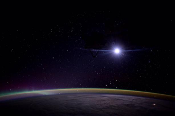 Ранее Рубинс сделала снимок Луны, которая восходит над ночной частью Земли. На снимке также можно было увидеть вспышки полярного сияния над Землей.