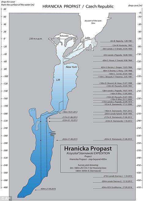Поэтому данная глубина не является окончательной. В скором времени ученые намерены продолжить исследования и, возможно, им удастся достигнуть дна карстовой воронки. По мнению специалистов, глубина чешской пещеры может достигать 700 и даже 1 000 метров.