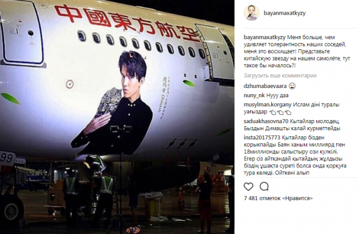 "Меня больше чем удивляет толерантность наших соседей, меня это восхищает! Представьте китайскую звезду на нашем самолете, тут такое бы началось?!" - написала Баян Есентаева на своей странице в Instagram.