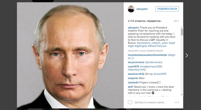 Элтон Джон опубликовал в Instagram фото российского лидера и сопроводил его словами: "Спасибо президенту Владимиру Путину за то, что он вышел на связь и поговорил сегодня со мной по телефону. Жду встречи с вами лицом к лицу, чтобы обсудить вопросы равенства представителей ЛГБТ", - написал певец. При этом подробности разговора музыкант не раскрыл.
