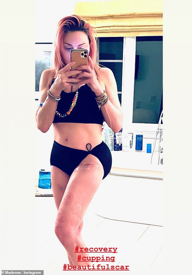 62-летняя звезда опубликовала снимки в Instagram-сториз, на которых позирует в черном коротком топе, продемонстрировав шрам после операции на бедре, а также следы от банок на ногах. Она подписала снимок хештегами "восстановление", "банки" и "красивый шрам".