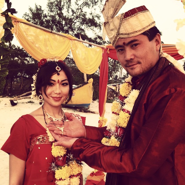 Одной из самых необычных свадеб можно назвать торжество режиссера Канагата Мустафина. Он со своей избранницей Гулим Досановой предпочел сыграть свадьбу на курорте Гоа в индийском стиле. Отметим, что сейчас Канагат работает над романтической комедией "16 кыз".