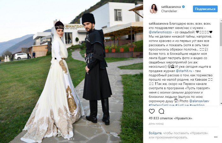 На своей странице в Instagram артистка выложила фотографии со свадебного торжества, где она и ее избранник, итальянский фотограф Стефано Тиоццо, облачены в национальные кабардинские наряды. Как пишет певица, торжество прошло на ее малой родине, на Кавказе.