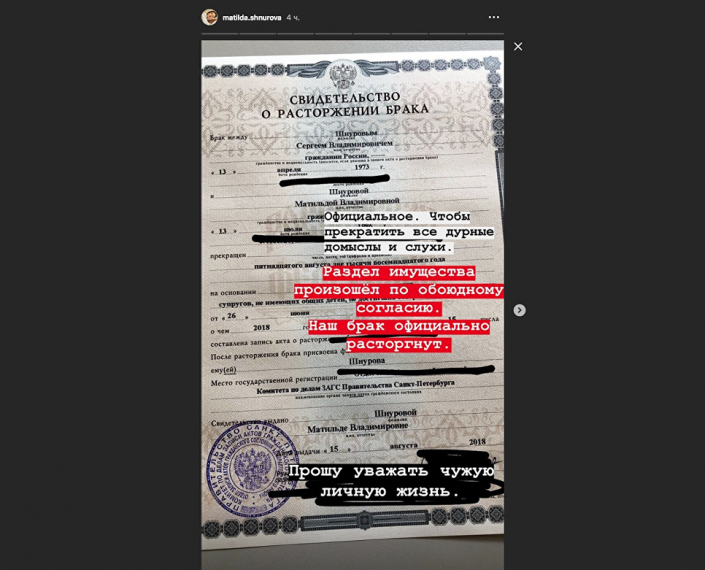 Матильда опубликовала фотографию свидетельства о расторжении брака, отметив, что раздел имущества произошел по обоюдному согласию.
