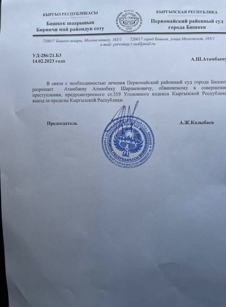 "Кроме того, по предварительным данным, Алмазбеку Атамбаеву суд разрешил выехать за пределы страны. Известно, что такое решение принято из-за его болезни", - пишет издание.