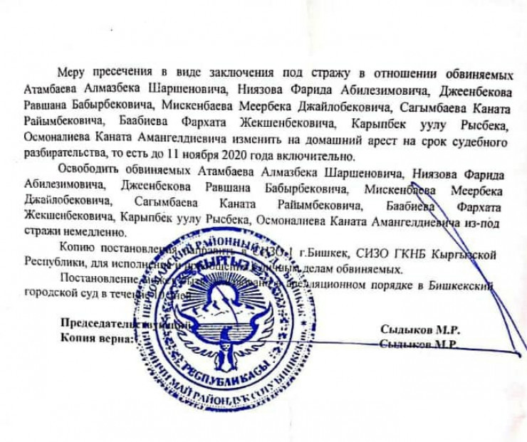 Освободить обвиняемых Атамбаева Алмазбека Шаршеновича, Ниязова Фарида Абилезимовича, Джеенбекова Равшана Бабырбековича, Мискенбаева Меербека Джайлообековича, Сагымбаева Каната Райымбековича, Баабиева Фархата Жекшенбековича, Кырпбек уулу Рысбека, Осмоналиева Каната Амангельдиевича из-под стражи немедленно", - говорится в постановлении, которое опубликовал адвокат.