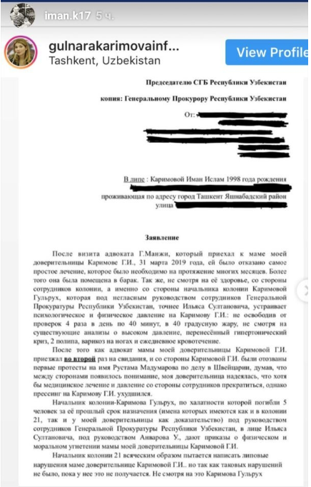 Дочь Гульнары Каримовой Иман опубликовала в Instagram заявление, написанное на имя главы Службы государственной безопасности (СГБ) и генерального прокурора Узбекистана. Об этом сообщает CA-NEWS, передает Tengrinews.kz.