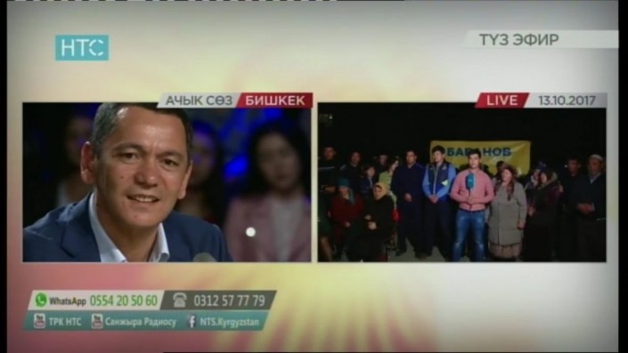 Другой фаворит предвыборной гонки - лидер парламентской оппозиции Омурбек Бабанов провел прямую линию, которая транслировалась на всех независимых телеканалах: НТС, ТНТ, МИР, Next TV, СТС – НБТ, РенТВ, Санат ТВ, New ТВ, а также в эфире местных радиостанций - "Кыргызстан обондору", "Санжыра", "Марал ФМ", "Тумар ФМ". Передача началась с вопроса касательно ситуации на границе Казахстана и Кыргызской Республики. Кандидат в прямом эфире рассказал об отношениях со странами ближнего и дальнего зарубежья, поделился своим видением дальнейшего развития страны.