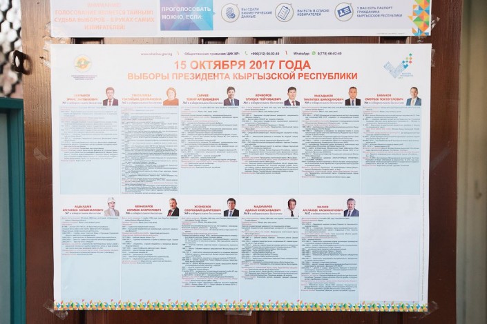 Кандидаты в президенты Кыргызской Республики на плакате в избирательном участке. Фото Tengrinews.kz