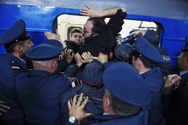 Сегодня участники акции перекрыли несколько центральных улиц Еревана. Накануне лидер протестного движения, руководитель парламентской фракции "Елк" Никол Пашинян заявил, что его сторонники намерены заблокировать мосты, улицы и станции метро.