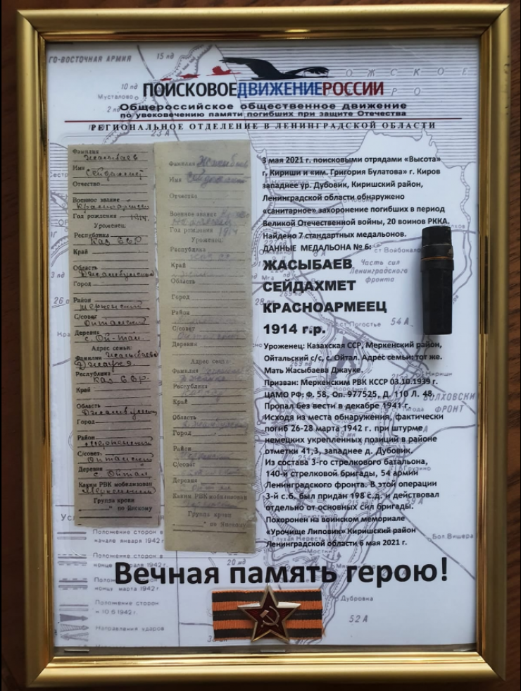 "В сентябре этого года на международной конференции поисковиков в Нур-Султане замкомандира поискового отряда "Переправа" города Лодейное Поле Алексей Костяков передал мне медальон Сейдахмета Жасыбаева. Сейчас мы ищем родных героя, чтобы вернуть реликвию домой", - сказал Шитов.