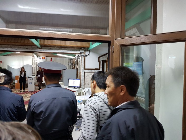 Пока голосовал Сооронбай Жээнбеков, в избирательный участок из-за большого количества прессы не смогли попасть другие граждане, пришедшие на выборы. У входа в какой-то момент образовалась очередь. Люди радовались и удивлялись, что живут по соседству с кандидатом в президенты.