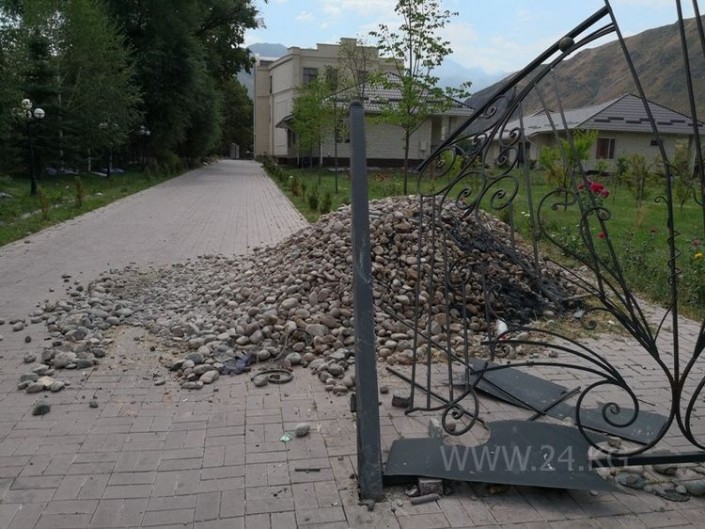 Сторонники Алмазбека Атамбаева сами наводят порядок. Они убирают камни и мусор вдоль дороги. В самом доме бывшего президента тоже тихо. Прямо у входа - сожженные маршрутки спецназа, искореженные ворота, въезд забаррикадирован деревянными столами.