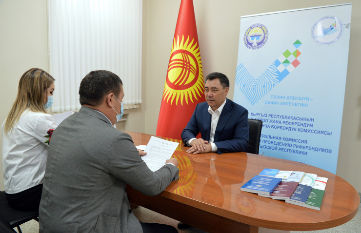 "Согласно постановлению ЦИК КР о перечне документов для кандидатов на должность президента Кыргызской Республики, Садыр Жапаров предоставил заявление кандидата о намерении баллотироваться на должность Президента страны, сведения об отсутствии гражданства иного государства, письменное согласие на обработку персональных данных на наличие либо отсутствие гражданства иностранного государства, сертификат об уровне владения государственным языком и иные необходимые справки, формы и копии документов", - говорится в сообщении.