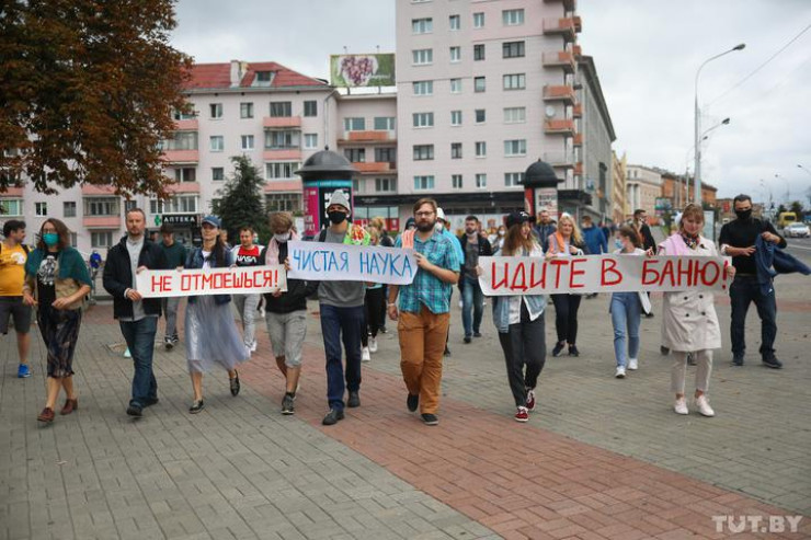 Акцию "Банный день" в поддержку чистой науки провели ученые в Минске. Они пришли с плакатами к зданию академии в полотенцах и банных шапочках. Как сообщили журналисты TUT.by, вокруг было замечено большое скопление силовиков.