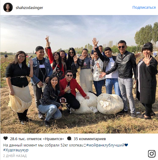 Певица Шахзода приехала в компании фанатов, которые собрали более 50 килограммов хлопка. Об этом она написала на своей страничке в Instagram.