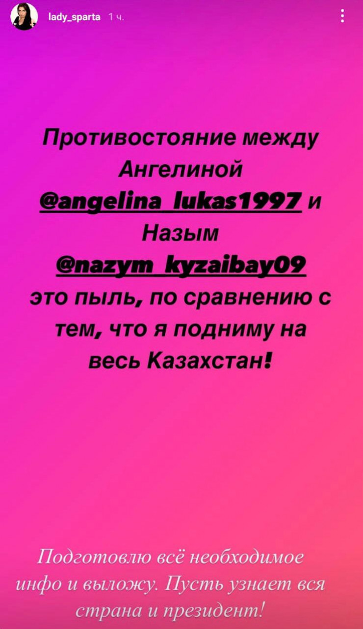 "Противостояние между Ангелиной Лукас и Назым Кызайбай - это пыль по сравнению с тем, что я подниму на весь Казахстан! Подготовлю все необходимое инфо и выложу. Пусть узнает вся страна и Президент!" - написала далее боксерша.