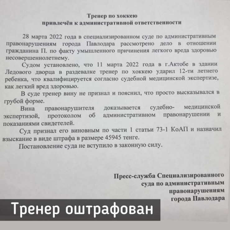 "Установлено, что 11 марта этого года в раздевалке ледового дворца Актобе тренер ударил 12-летнего ребенка, тем самым умышленно причинил легкий вред здоровью. Свою вину он не признал и пояснил, что просто высказывался в грубой форме", - сообщили в пресс-службе суда.