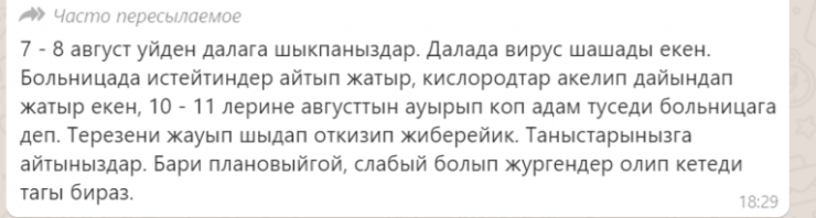 Жақында қазақстандықтар WhatsApp арқылы фейк таратты. Хабарламада 7-8 тамызда "вирус шашылатыны", сондықтан далаға шықпау керегі жазылған. Жазба авторы "аурухана қызметкерлерінің" айтқанына сүйенген. Олар "стационарларда ауру жұқтырған науқастардың жаппай түсуіне дайындалып, оттегі баллондарын дайындап жатыр" екен.