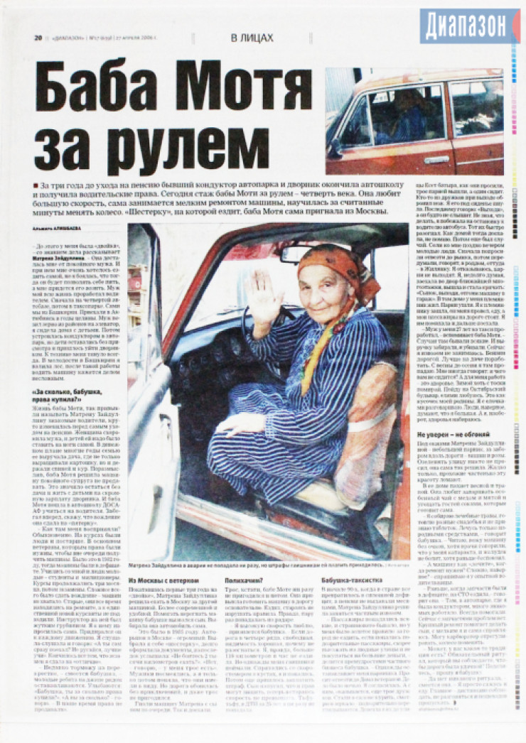 Баба Мотя вспоминала, как в далеком 1956 году они с мужем переехали в Актюбинск, вырастили троих детей. Ее супруг работал водителем, она устроилась кондуктором, затем работала дворником. В тяжелые 90-е после смерти мужа она закончила автошколу и стала подрабатывать таксисткой.