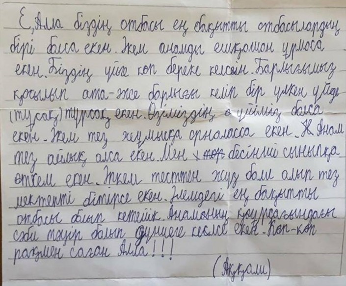 "(...) Өзіміздің үйіміз болса екен. Әкем тез жұмысқа орналасса екен. Анам тез айлық алса екен. Мен бесінші сыныпқа өтсем екен. Әпкем тесттен жүз балл алып, тех мектепті бітірсе екен. Әлемдегі ең бақытты отбасы болып кетейік. Анамның құрсағындағы сәби тәуір болып дүниеге келсе екен", - деп тілек жазылған таралған хатта.