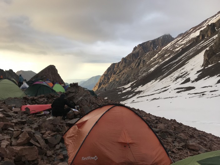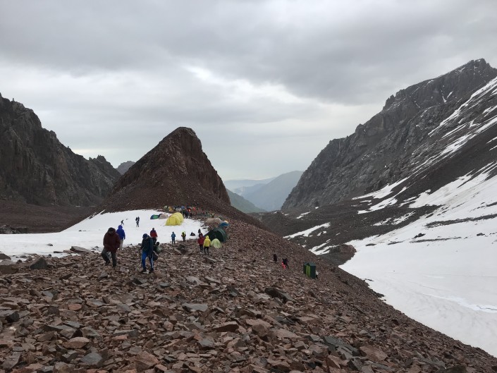 Обычно палаточный лагерь разбивают близ ледника Богдановича. Местность каменистая, кое-где лежит снег. Погода и температура в горах меняются почти каждый час. Яркое солнце может резко сменить снег и холодный дождь. На этот раз ночевать пришлось под дождем.