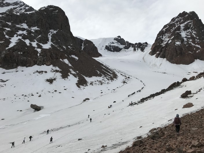 Официально трасса Альпиниады открывается в 5 утра. Для этого нужно встать примерно в 2 часа ночи, чтобы дойти до перевала Комсомол. Уже к 6 утра на перевале выстраивается длинная очередь. У тех, кто пришел позже, шансы взобраться на пик Нурсултан минимальны.