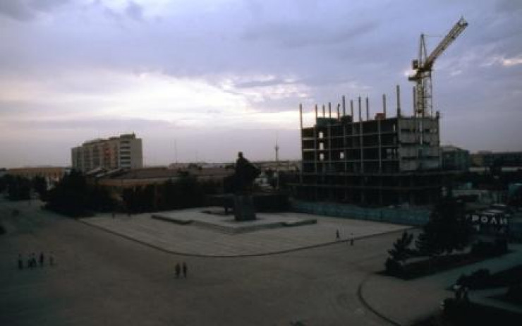На следующей фотографии показан Ленин на постаменте. Позади него строится 16-этажное здание, которое одно время было самым высоким в городе. Сейчас в нем располагается Академия государственного управления при Президенте. Фотография сделана как раз из окна гостиницы "Ишим".