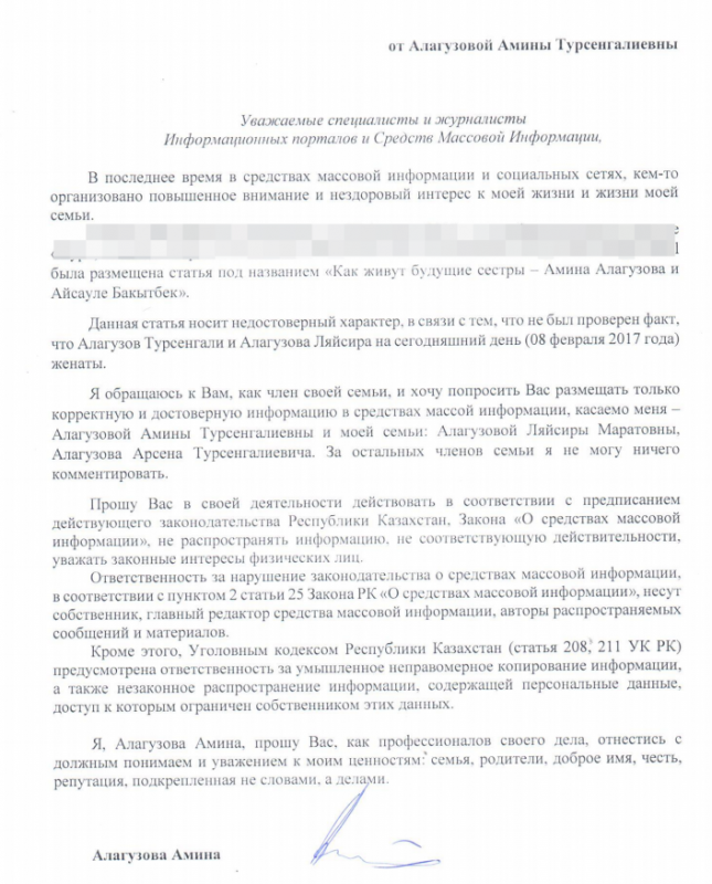 По словам Амины Алагузовой, в последнее время повышен интерес к ее личной жизни и ее семье. Амина Алагузова отмечает, что в одном из казахстанских изданий вышел материал с недостоверной информацией о ней и дочери Баян Есентаевой. Дочь Турсенгали Алагузова написала в заявлении, что ее родители на сегодняшний день находятся в браке. Девушка просит СМИ размещать корректную информацию касательно ее семьи.