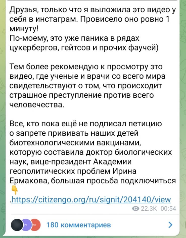 Айна Бакеева Telegram-арнасында оқырмандарын Биология ғылымдарының докторы, геосаяси мәселелер академиясының вице-президенті Ирина Ермакова жасаған петицияны толтыруға шақырған болатын. Онда "ауруға, өлімге әкелуі мүмкін қауіпті биотехнологиялық вакциналарды балаларға жаппай салуға тыйым жасау" керегі айтылады.
