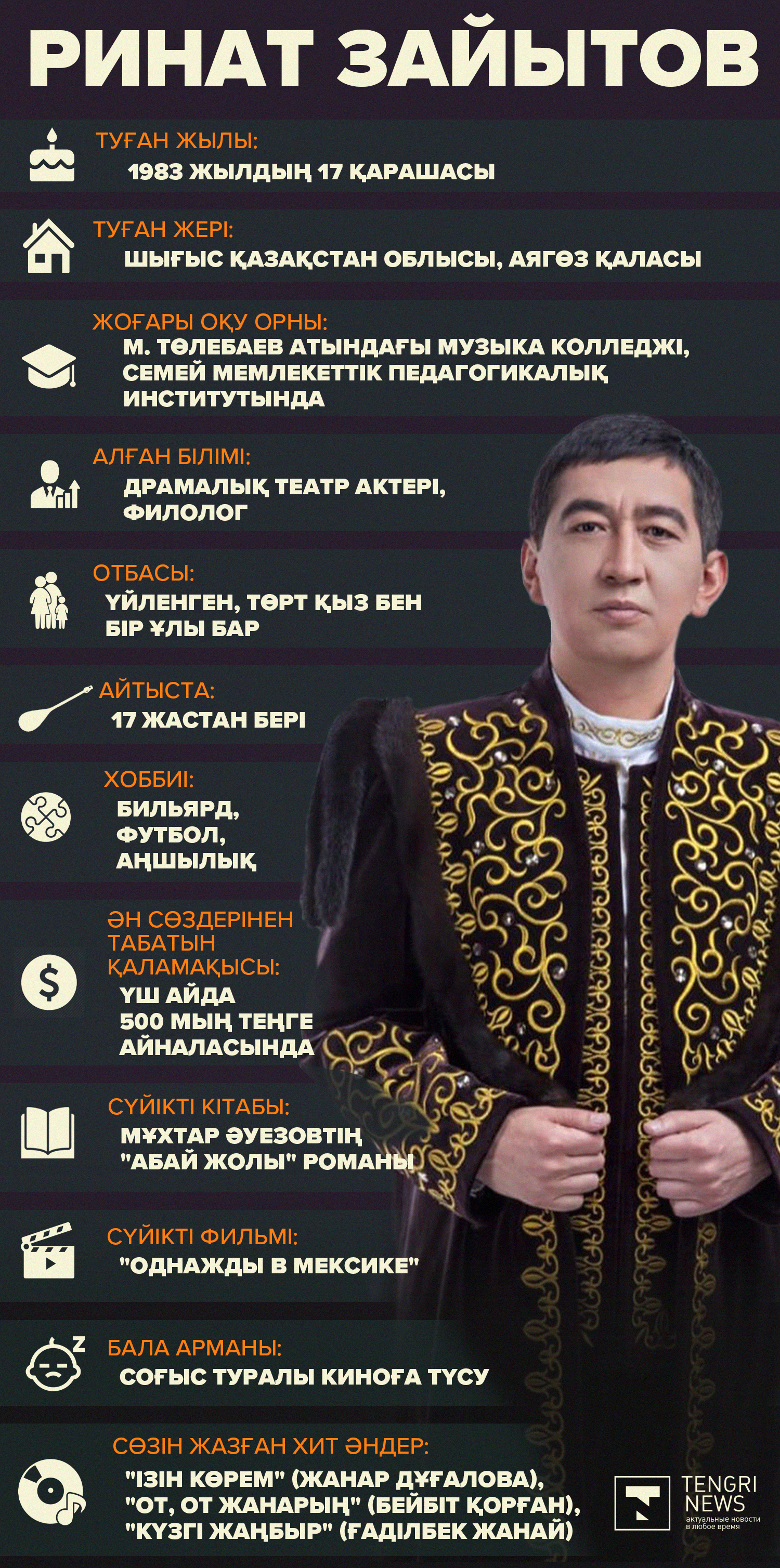Бес баланың әкесі, актер, хит әндердің авторы. Сіз кімсіз, Ринат Зайытов?