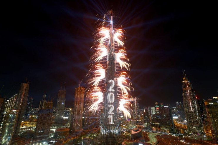Жители и гости Дубая встретили Новый год фейерверком на 828-метровом небоскребе Бурдж-Халифа.