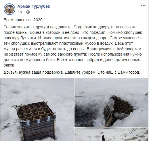 "Чиновник из Казахстана украл мой сегодняшний пост. Арман Турлубек, председатель Комитета по водным ресурсам Министерства экологии Казахстана, опубликовал в своем Facebook и Instagram пост, в котором рассказал, как он очищает дворы от фейерверков. Но почему-то использовал мой текст и мои фото. Сказать, что я удивлен, это ничего не сказать. Больше всего меня возмущает не сам факт воровства авторского контента, а тот факт, что чиновники такого уровня делают такие стыдные вещи в 2020 году", - написал Матис-Сиразеев.