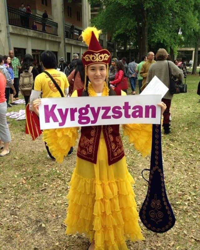 "Я привезла в США комуз и кыргызское платье. В колледже проводились мероприятия, где студенты из разных стран знакомили других с культурой своих народов, готовили национальные блюда. Я играла там на комузе и угощала кыргызскими блюдами". Фото предоставлено Астрой Рахматилла кызы