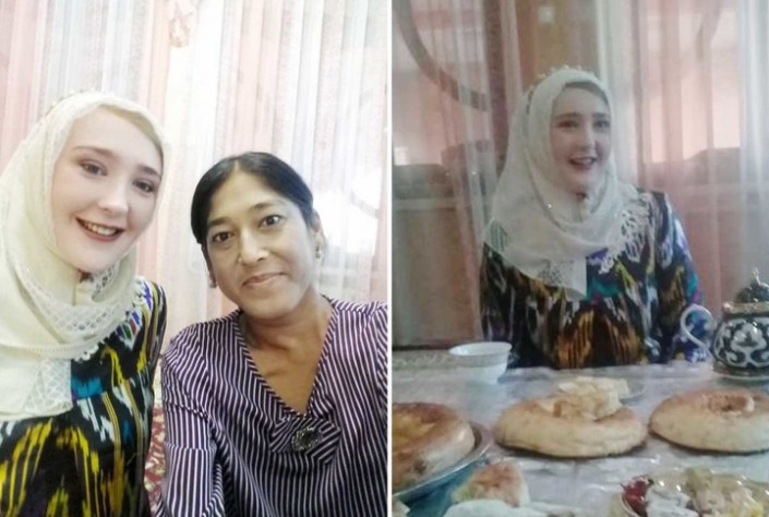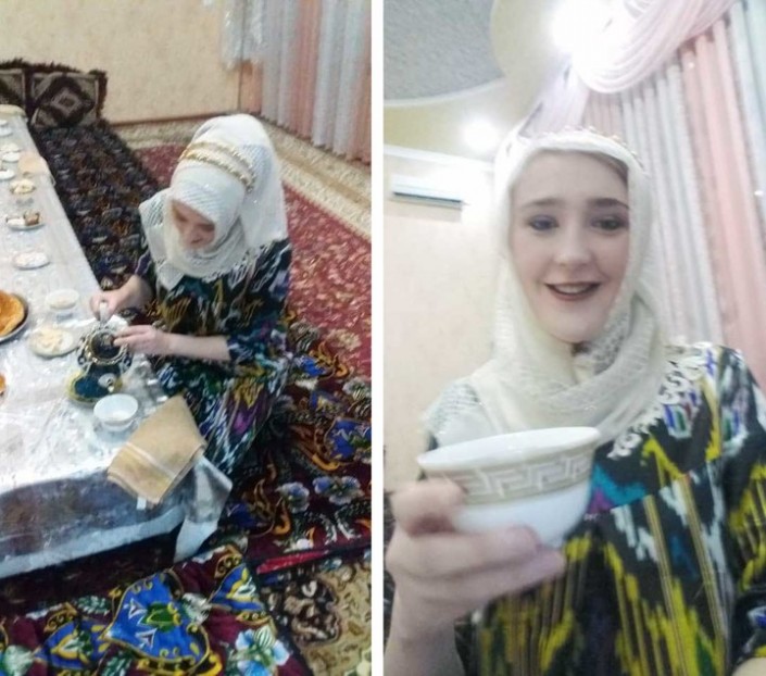 По словам европейской келин, она с легкостью привыкла к узбекскому укладу жизни и традициям. Молодая невестка подметает ранним утром двор, выполняет домашние работы и учится готовить местные блюда.