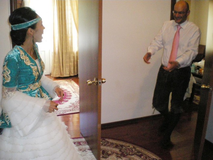 Переодевшись в свой наряд, я поплелась за Ники, который до этого ни разу не видел казахского национального костюма. И кто-то даже запечатлел этот момент.