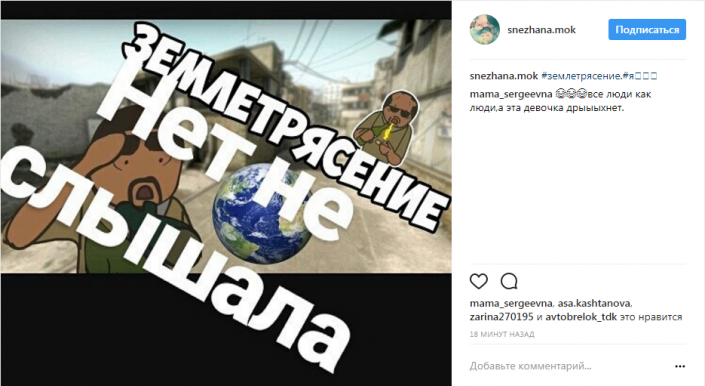 Если раньше мы могли повернуться на другой бок и спать дальше, то сейчас мы схватили детей и встали под арку. Мне было страшно. За детей. Мы живем на 10 этаже и амплитуда колебания тут больше. Прочувствовали каждую секунду", - написала пользователь Gaukhar_zhanys.