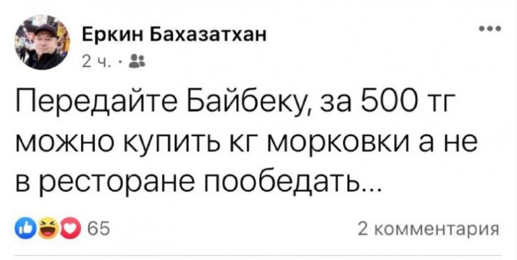 Осыдан бірнеше жыл бұрын Алматының бұрынғы әкімі Бауыржан Байбек қалада 500 теңгеге түскі ас ішуге болатынын айтып, бұл сөзі желіде талқыланып еді. Ал қазір бұл сомаға бір келі сәбіз ғана алуға болады.