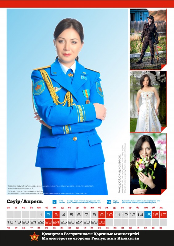 Календарь, составленный по итогам конкурса красоты среди сотрудниц Министерства обороны "Батыр Арулар", опубликован тиражом в тысячу экземпляров. О том, что каждая из 12 финалисток украсит страницы определенного месяца специализированного календаря на 2016 год, было объявлено сразу после старта конкурсного интернет-голосования.