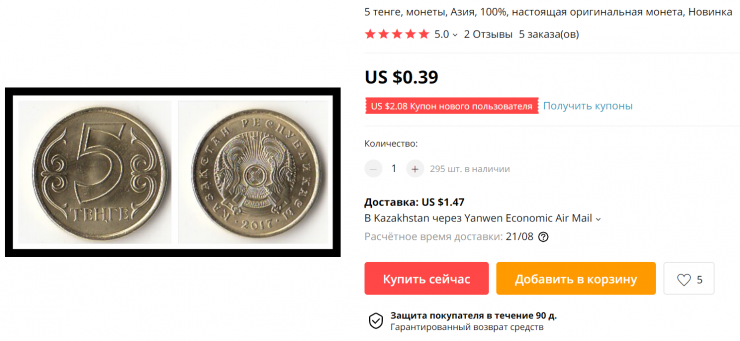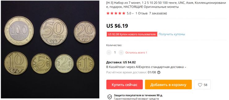 На популярной виртуальной торговой площадке AliExpress, занимающейся в основном реализацией китайских товаров, появились объявления о продаже казахстанских монет тенге, передает корреспондент Tengrinews.kz.
