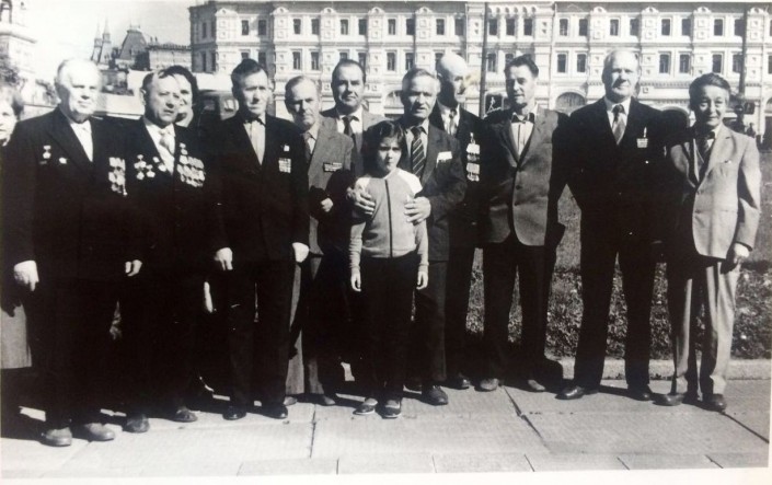 Карина Абдуллина с дедушкой (в центре) и его однополчанами на Красной площади в Москве. 1985 год.