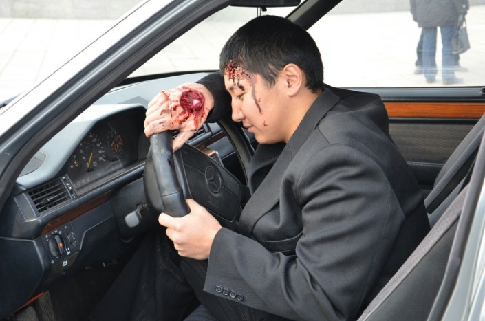 В самом центре города, где всегда многолюдно, участники акции изображали жертв ДТП. Реалистичные травмы, кровь - все как при настоящей аварии.