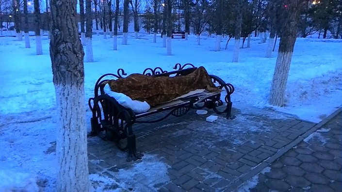 В столичном парке рядом с мостом возле микрорайона "Самал" на одной из лавочек провел ночь мужчина. И это при том, что температура воздуха в это время была ниже нуля. Молодой человек приспособил в качестве кровати скамейку, положил под голову подушку и накрылся одеялом. Так он проспал до утра, сообщает корреспондент Tengrinews.kz.