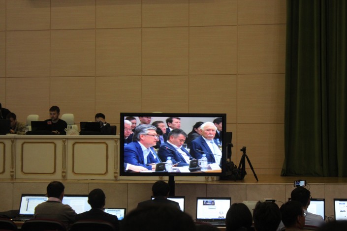Журналисты смотрят трансляцию заседания комиссии по земельной реформе. Выступает Кайрат Бисетаев