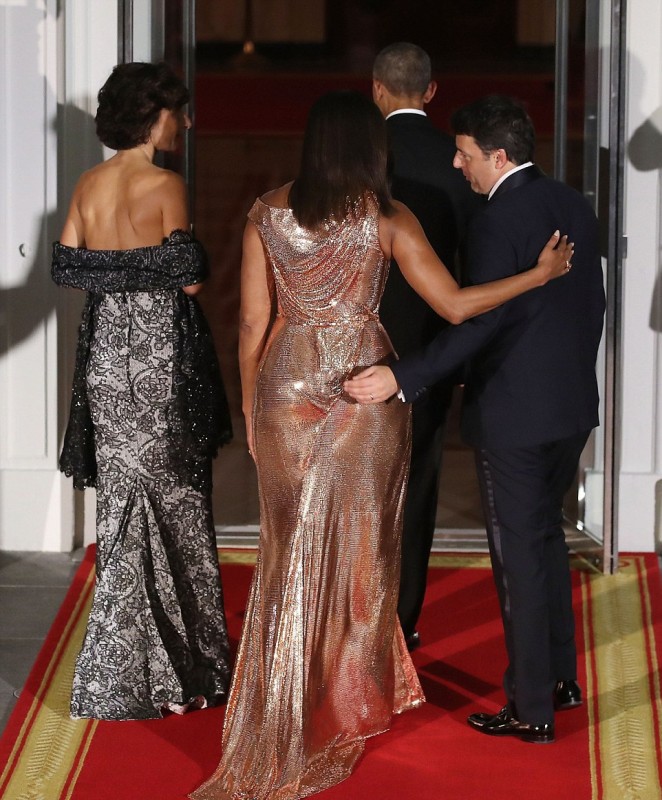 Впрочем, наибольшее внимание в этот вечер привлекла Мишель Обама. Она появилась перед гостями в ослепительном платье от Versace оттенка розового золота. Модель получила название Flotus. Наряд с ассиметричным кроем "на одно плечо" и сложными драпировками из ткани с металлизированной фактурой напоминал жидкое золото, струящееся вдоль тела.