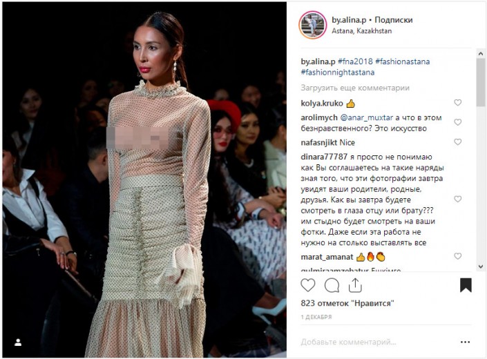 Она рассказала, что публика во время показа хорошо отреагировала на наряд. "Подходили ко мне с хорошими комментариями. Я радовалась, что у нас уже стали нормально относиться к fashion-индустрии. На тот момент я не знала, что везде уже гуляли видео с открытой грудью", - рассказала Динагуль.
