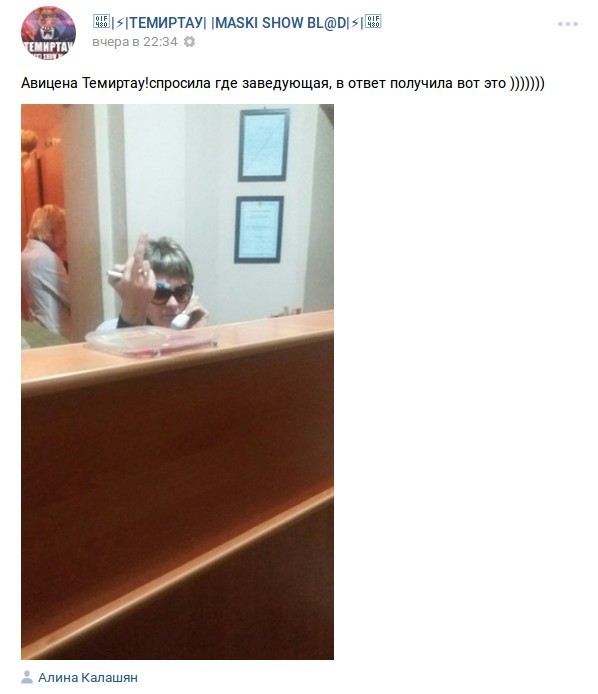 Медицинский работник в Карагандинской области показал неприличный жест пациентке. В частной клинике произошел инцидент. Жительница Темиртау потребовала снять темные очки с сотрудницы больницы. На что в ответ увидела неприличный жест, который успела снять на сотовый телефон и выложить фотографию в социальных сетях. Теперь сотрудница больницы собирается подать в суд на молодую девушку. Об этом корреспонденту Tengrinews.kz сообщили в клинике.