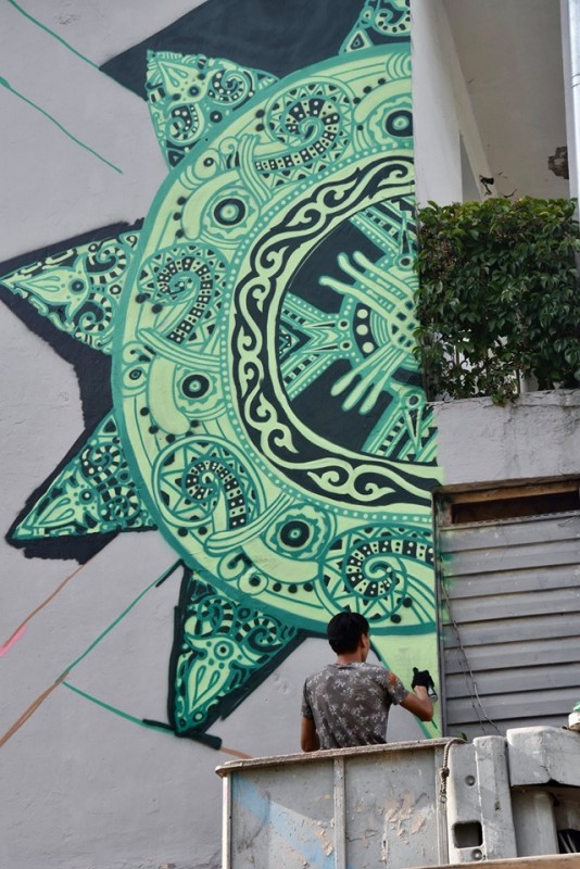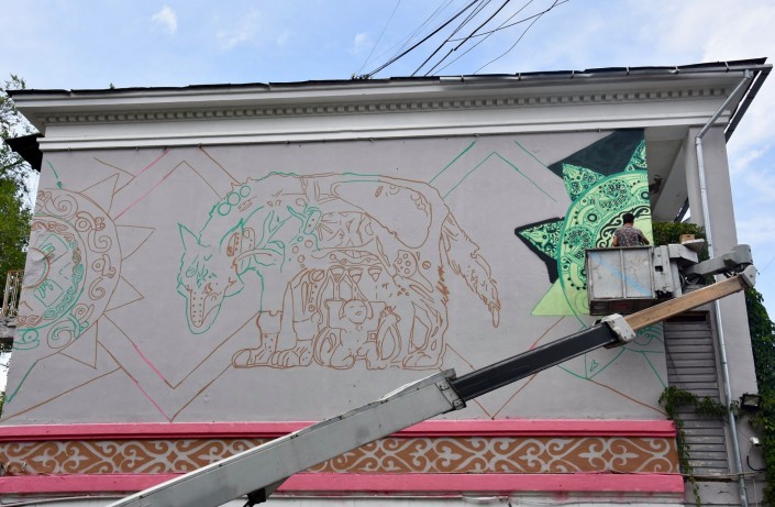 "Автор хотел показать в своей работе близость природы и человека, их связь и неделимость. Символ волка или волчицы вбирает в себя много положительных качеств, и поэтому он издревле является тотемом у тюркских народов. Внизу эскиза древнетюркскими рунами написано слово "тенгри", - рассказывают организаторы фестиваля Mural Fest на странице в Facebook.