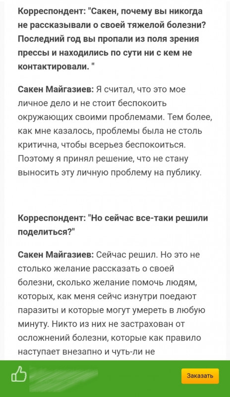 Желідегі жарнамаға сенсек, Сәкен Майғазиев орыс тілінде аталған дәрі туралы "сұхбат" беріп, оқырмандарға оны сатып алуға кеңес берген-мыс. Тіпті "ауыр дертке шалдыққаны" туралы да құпиясын ашады.